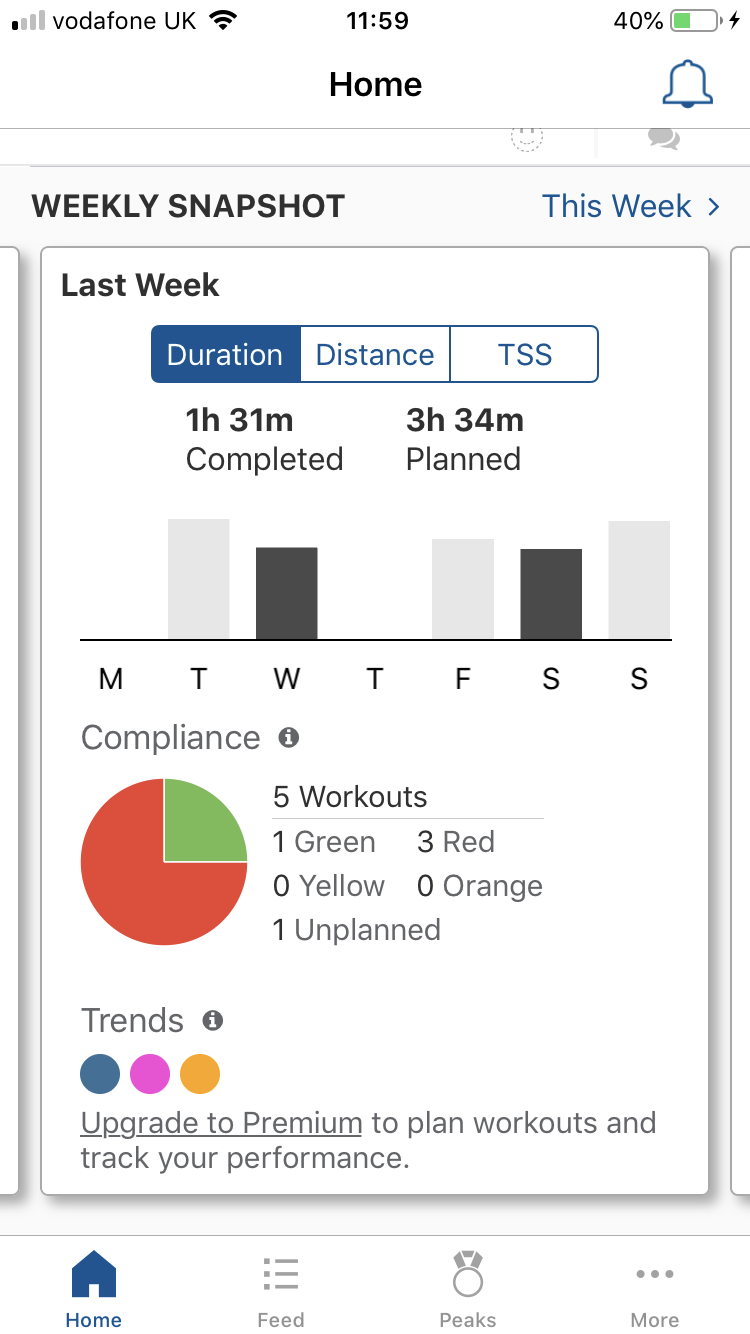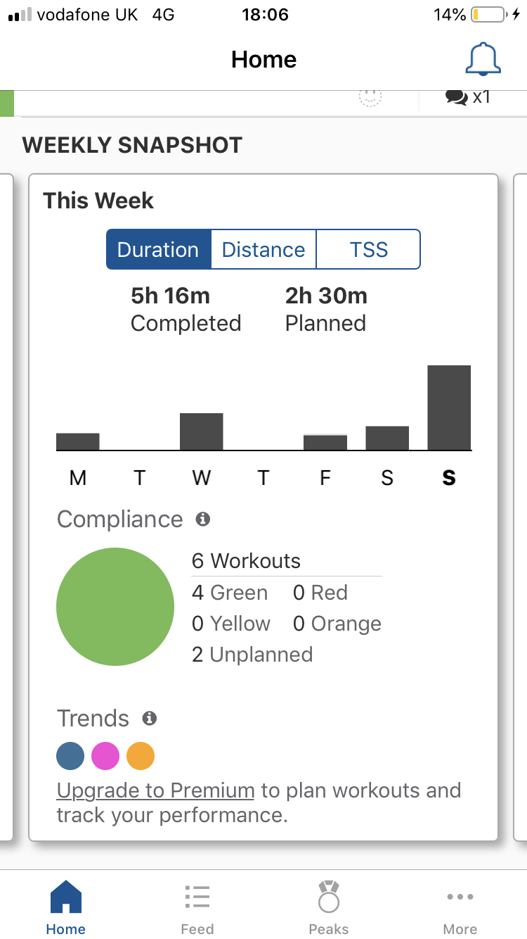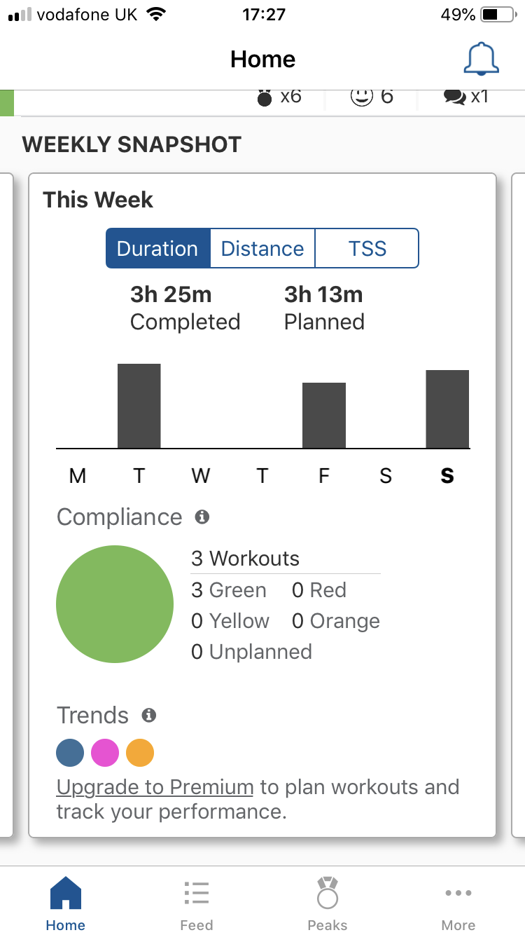 Wednesdays Swift was done and then training peaks was having a nightmare,and work was a little bit all over the place and before I knew it, it was Saturday with only one green tile in the whole week.